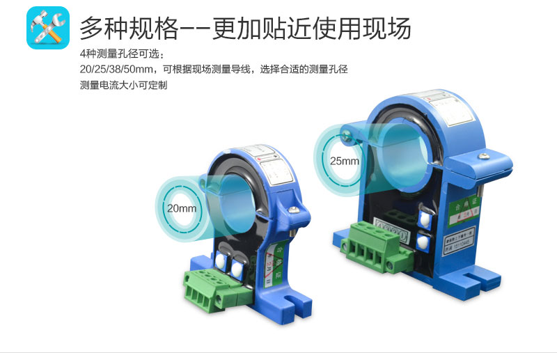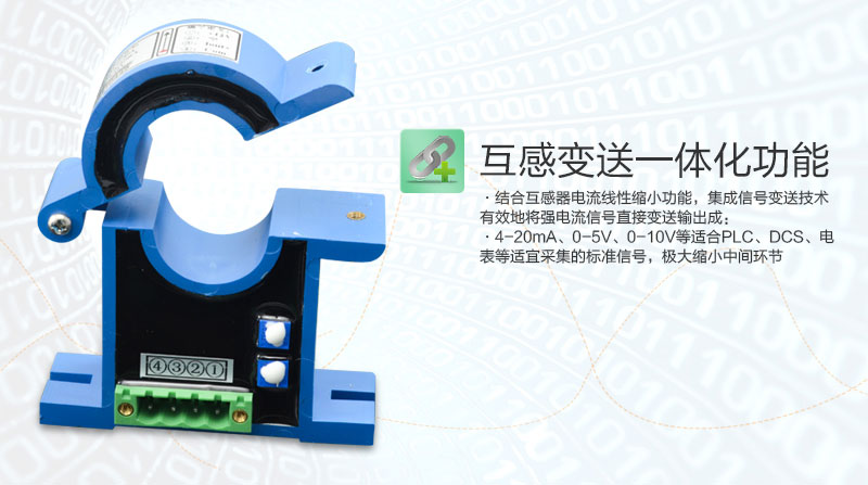 互感變送一體化功能,結合互感器電流線性縮小功能,集成信號變送技術有效地將強電流信號直接變送輸出4-20ma、0-5V、0-10V等適合PLC、DCS、電表等適宜采集的標準信號,極大縮小中間環節
