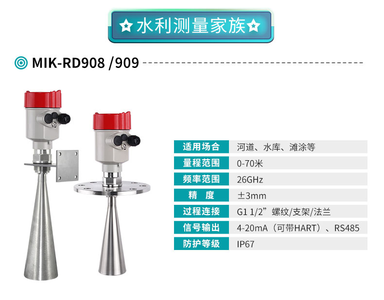 米科MIK-RD908雷達水位計,26G高頻系列可用于需要發(fā)射角度小精度高的場合,一般5米以上用。